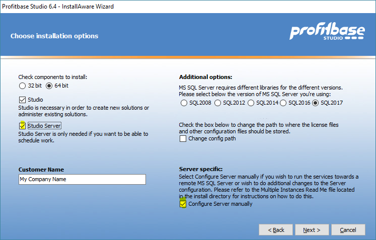 [General Settings] ; Where the files should be written InstallationDirectory=c:\temp ; Start menu folder ProgramFolder=Profitbase ; Which users should the application be installed for ; Current ; All InstallFor=All [SQL Settings] ; Select the proper version of SQL Server to use ; SQL2008 ; SQL2012 ; SQL2014 SQLVersion=SQL2012 [Components] ; Select which components should be installed, TRUE/FALSE 32BitStudio=TRUE 32BitStudioServer=FALSE 64BitStudio=FALSE 64BitStudioServer=FALSE [Server Specific] ; Select if the server should be configured manually or not ManualConfig=FALSE ; SQL Server Instance SqlInstance=server\instancename ; Service Username and password Username=domain\user Password=password |